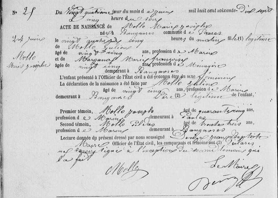 | - MOLLO Marie Madeleine (Naissance : 1875 Décès : 1876) - MOLLO Marie Joseph (Naissance : 1877 Décès : 1877) - MOLLO François Marie (Naissance : 1879 Décès : 1879) - MOLLO Marie Josephe (Naissance : 1888) - MOLLO Léonie (Naissance : 1891 Décès : 1891) |