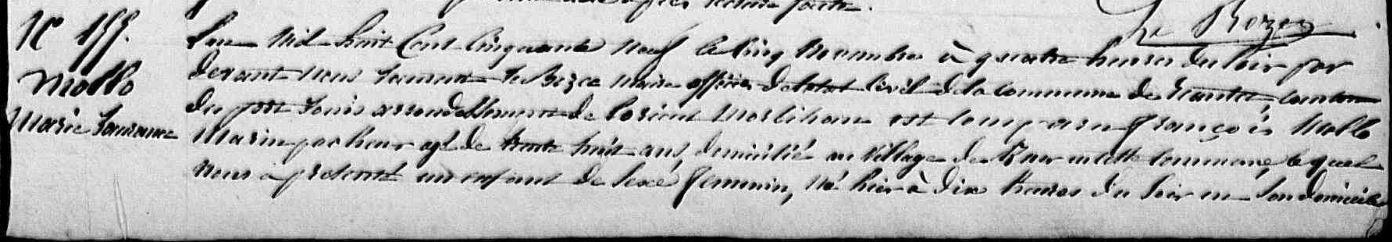 | Elle naît à Riantec (56), Locmiquélic 16/06/1775. Père : MOLLO Jean Naissance : Date : ../../1751 Mère : CAN (LE) Michelle Naissance : Date : 07/07/1746 Lieu : Riantec (56) A sa naissance, ses père et mère étaient âgés d'environ 24 ans et 28 ans. |