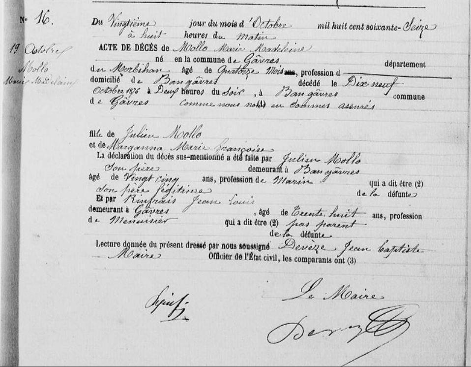Décès MOLLO Marie Madeleine - 1876 - Gâvres |
