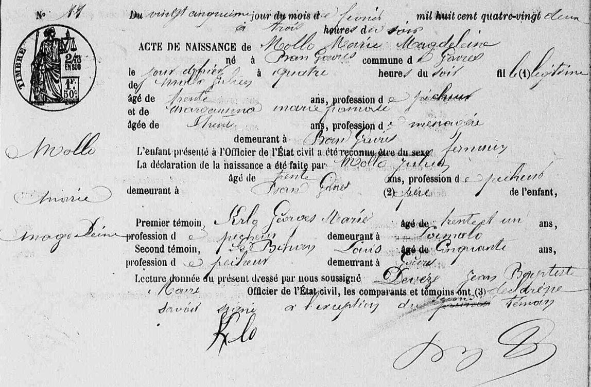 | Naissance MOLLO Marie Magdeleine - 1882 - Gâvres |