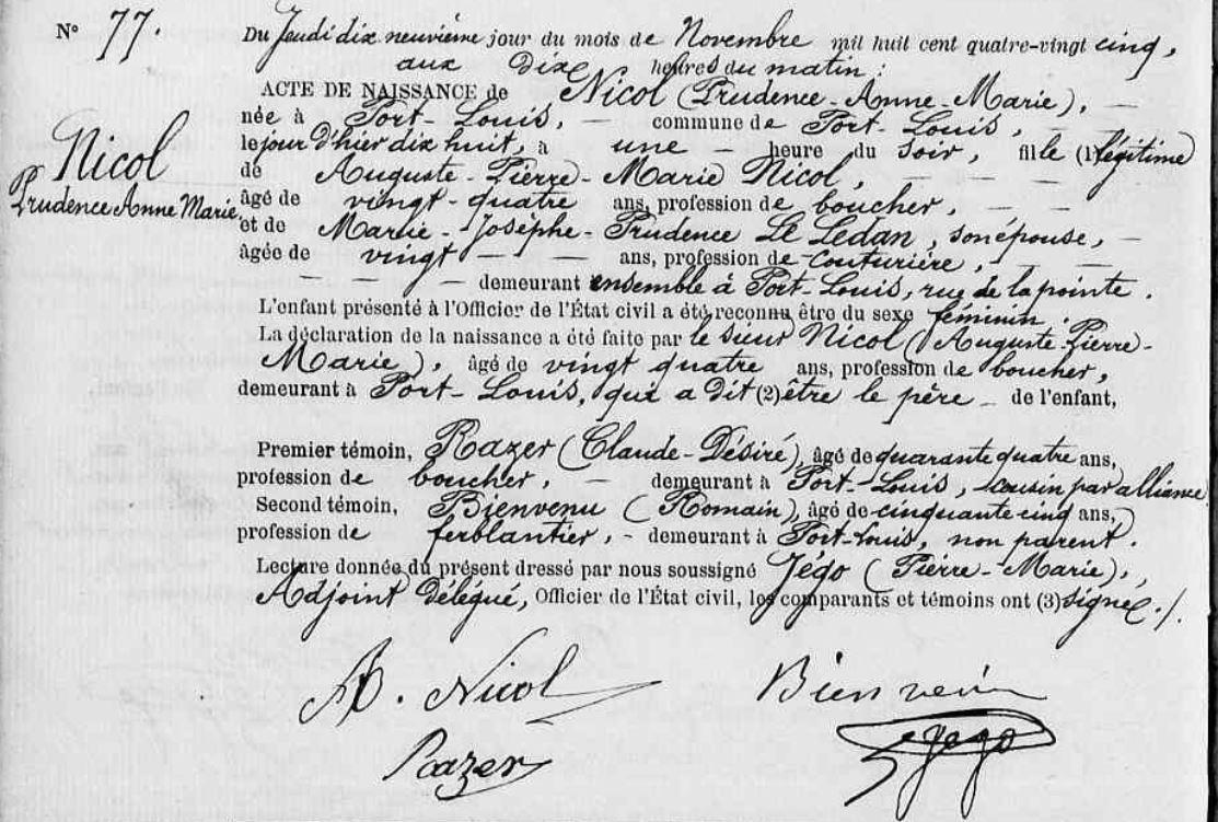 | Naissance NICOL Prudence Anne Marie - 1885 - Port-Louis |