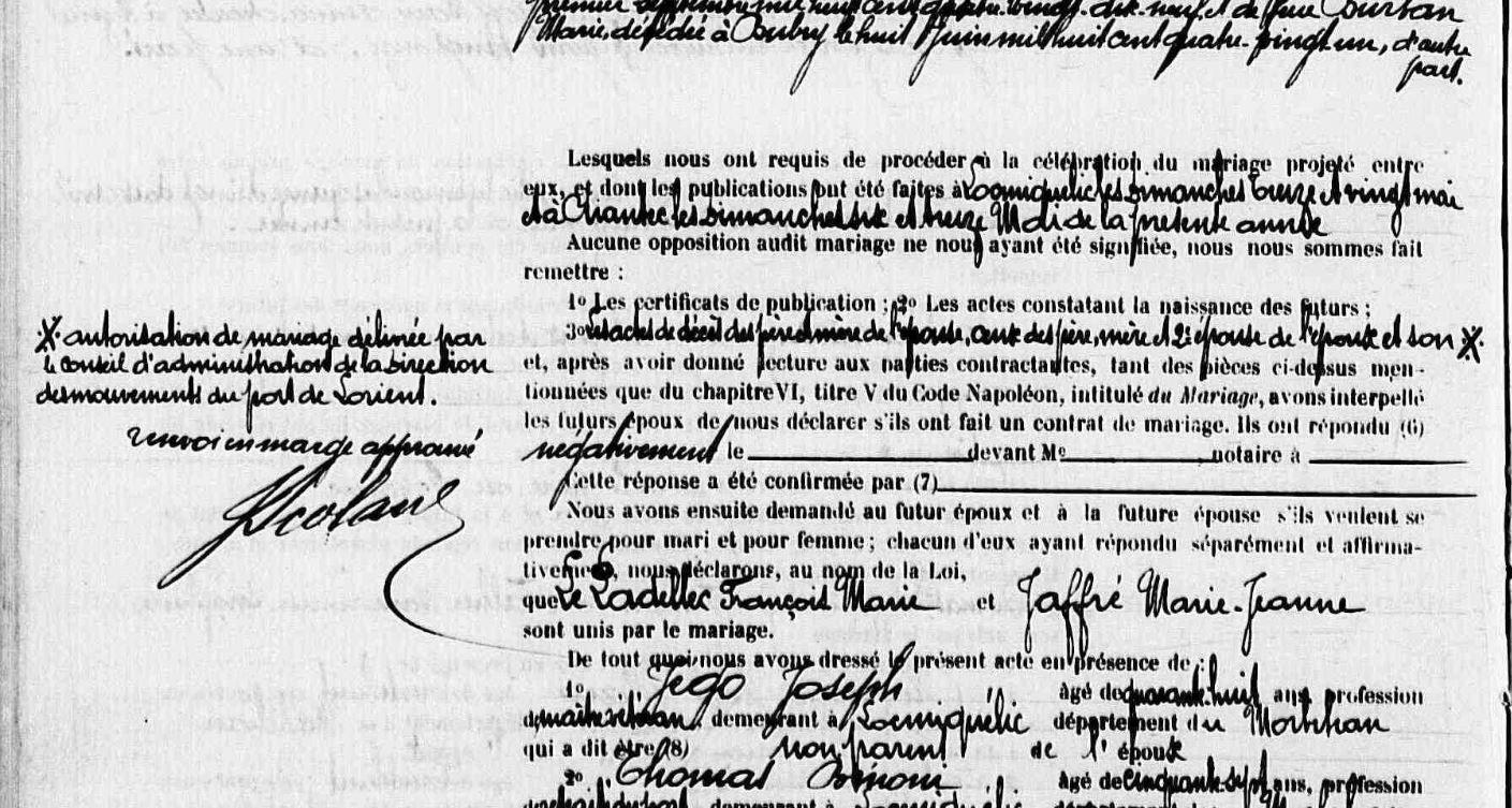 | Mariage 2 : Date : 02/06/1906 Lieu : Locmiquélic (56) JAFFRE Marie Jeanne, Ménagère 1 Elle voit le jour à Bubry (56), Kerbaie 15/03/1874 2. |
