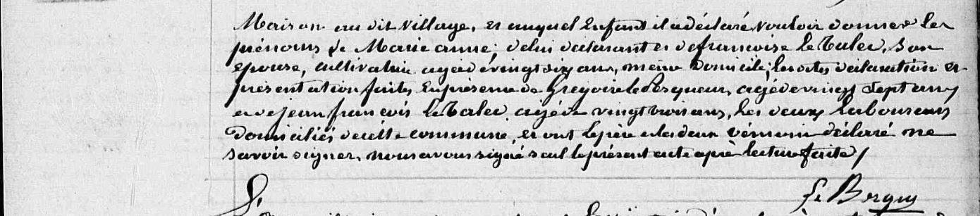 | 1. PEN (LE) Anne Naissance : Date : 12/07/1785 Lieu : Baud (56), Talforest Union : Date : 29/07/1813 Lieu : Baud (56) avec MALGUENAC Jean Marie. |