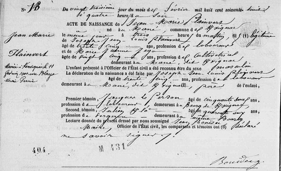 | Il voit le jour 23/02/1868 à Kervignac (56), Mané 1. Signature : Y. Père : PLEVERT Joseph Jean Louis, Cultivateur Naissance : Date : 20/03/1833 Lieu : Kervignac (56), Kerouallan Décès : Date : 14/12/1896 Lieu : Kervignac (56), Talhouët à l'âge de 63 ans. Mère : JEGO Marie Jeanne, Cultivatrice Naissance : Date : 11/07/1842 Lieu : Kervignac (56), Talhouët Décès : Date : 19/01/1905 Lieu : Kervignac (56), Kernours à l'âge de 62 ans. A sa naissance, ses père et mère étaient âgés de 34 ans et 25 ans. |