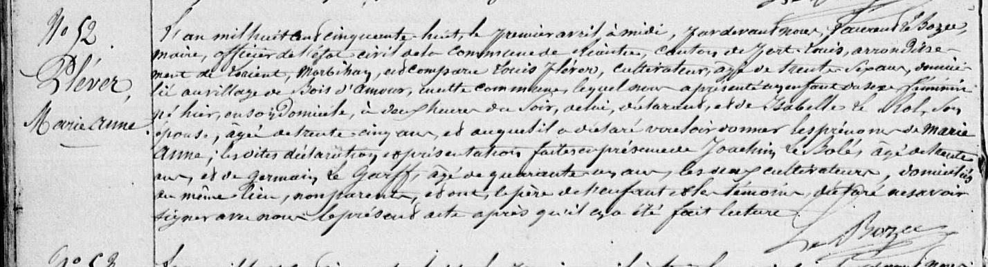 | 3. PLEVERT Marie Anne Naissance : Date : 31/03/1858 Lieu : Riantec (56), Bois d'Amour |