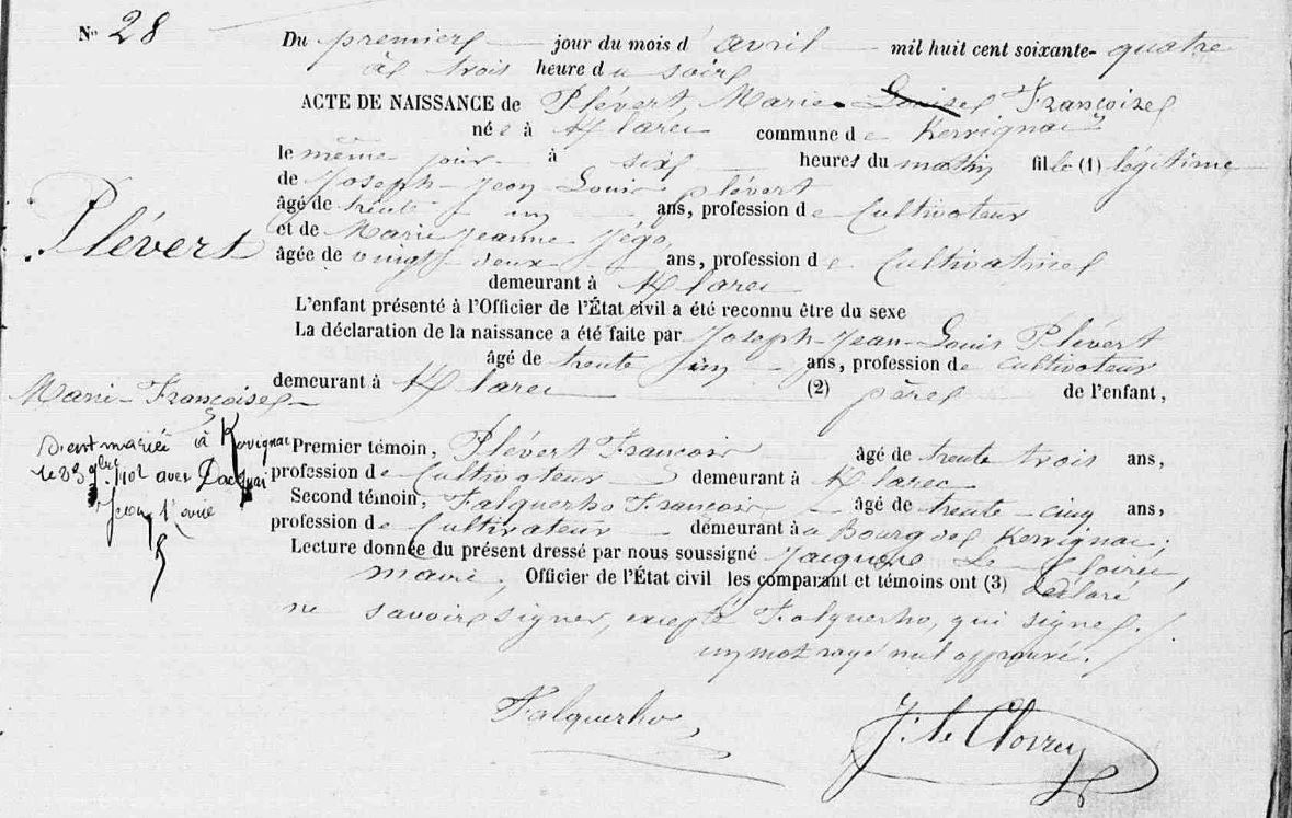 | Naissance PLEVERT Marie Françoise - 1864 - Kervignac |