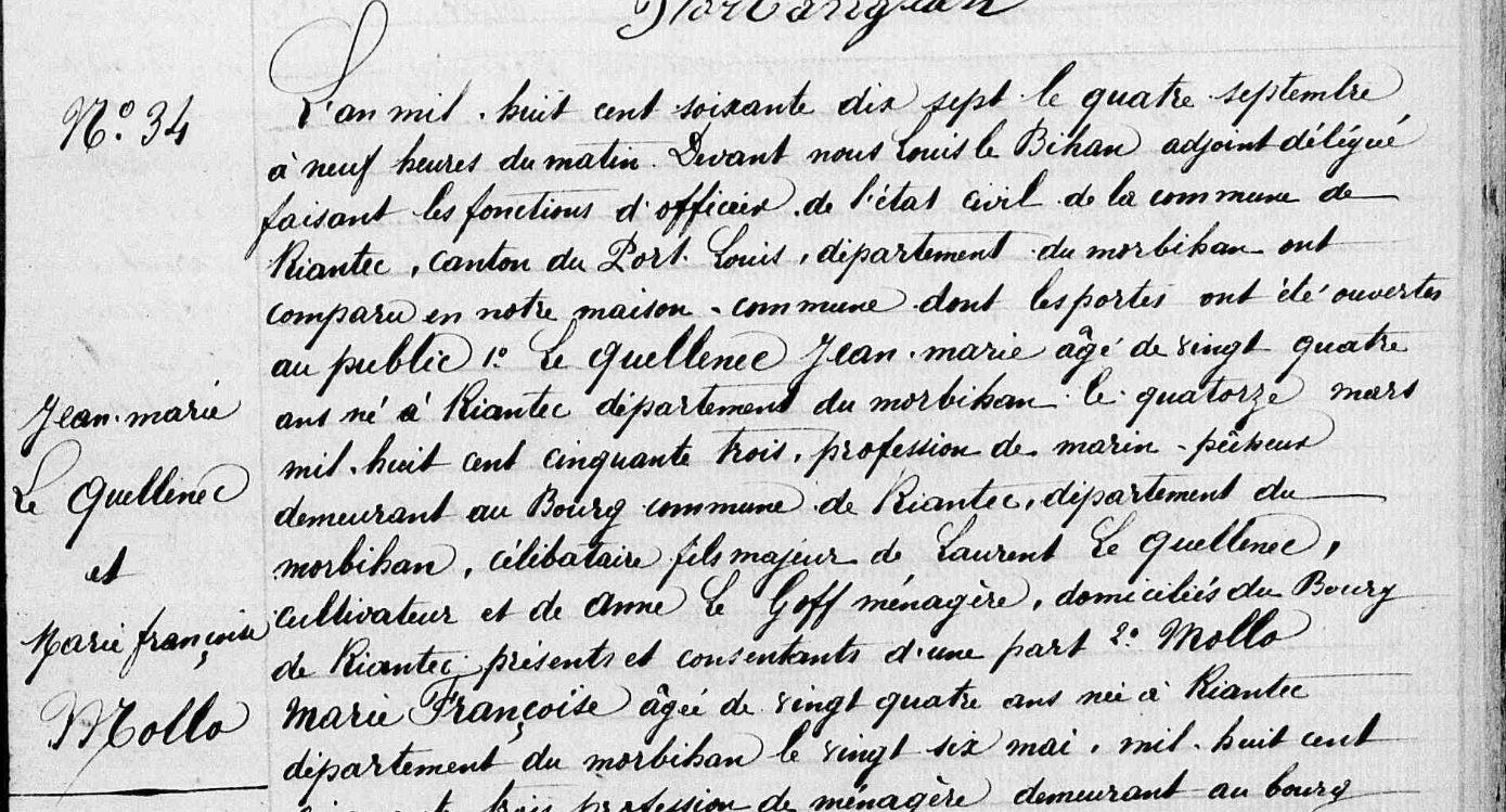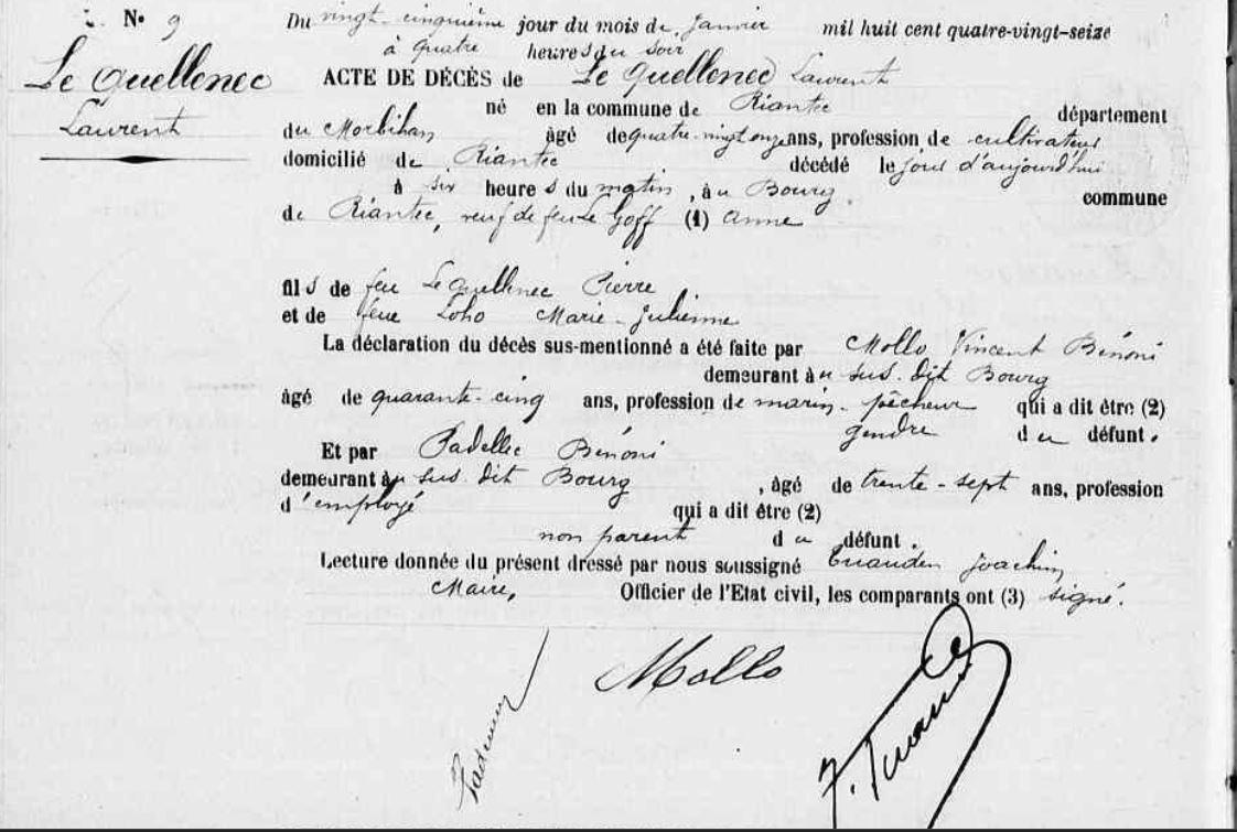 | 1. QUELLENEC (LE) Jean Marie Naissance : Date : 14/03/1853 Lieu : Riantec (56), Bourg Union : Date : 04/09/1877 Lieu : Riantec (56) avec MOLLO Marie Françoise. Décès : Date : ../../1917 à plus de 63 ans. |