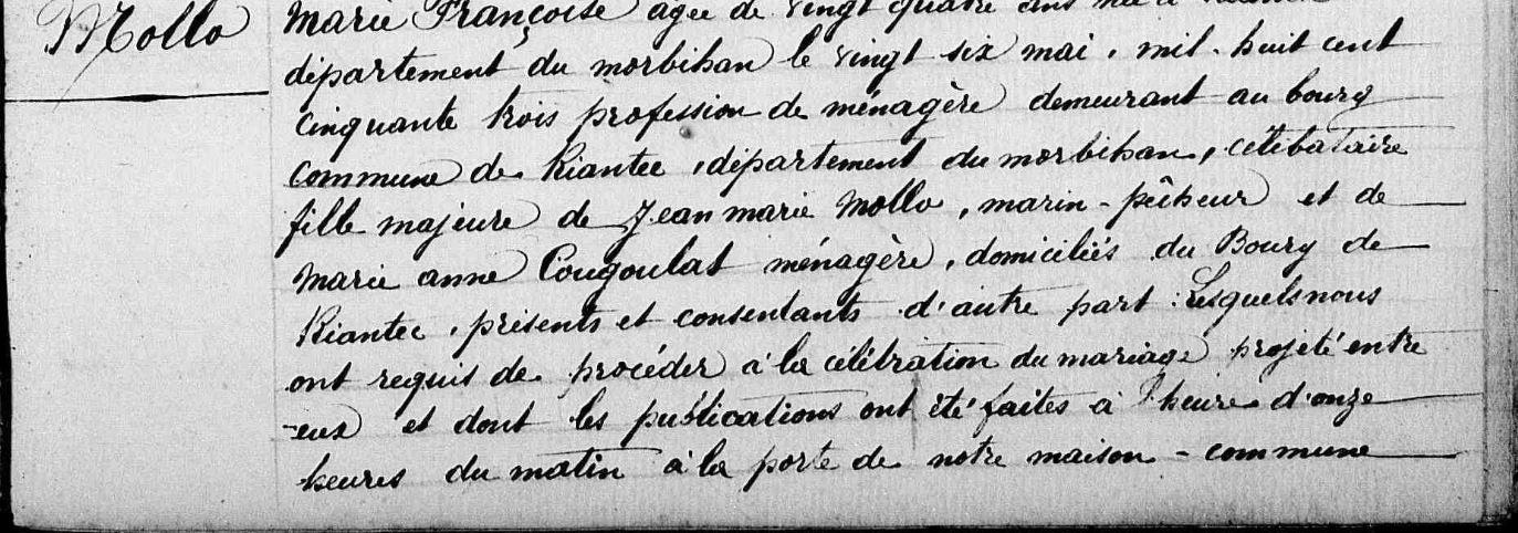 | Mariage : Date : 04/09/1877 Lieu : Riantec (56) MOLLO Marie Françoise, Ménagère Elle est née à Riantec (56), Kerner 26/05/1853. + > ../../1917 , 26 - - - NO à plus de 63 ans. |