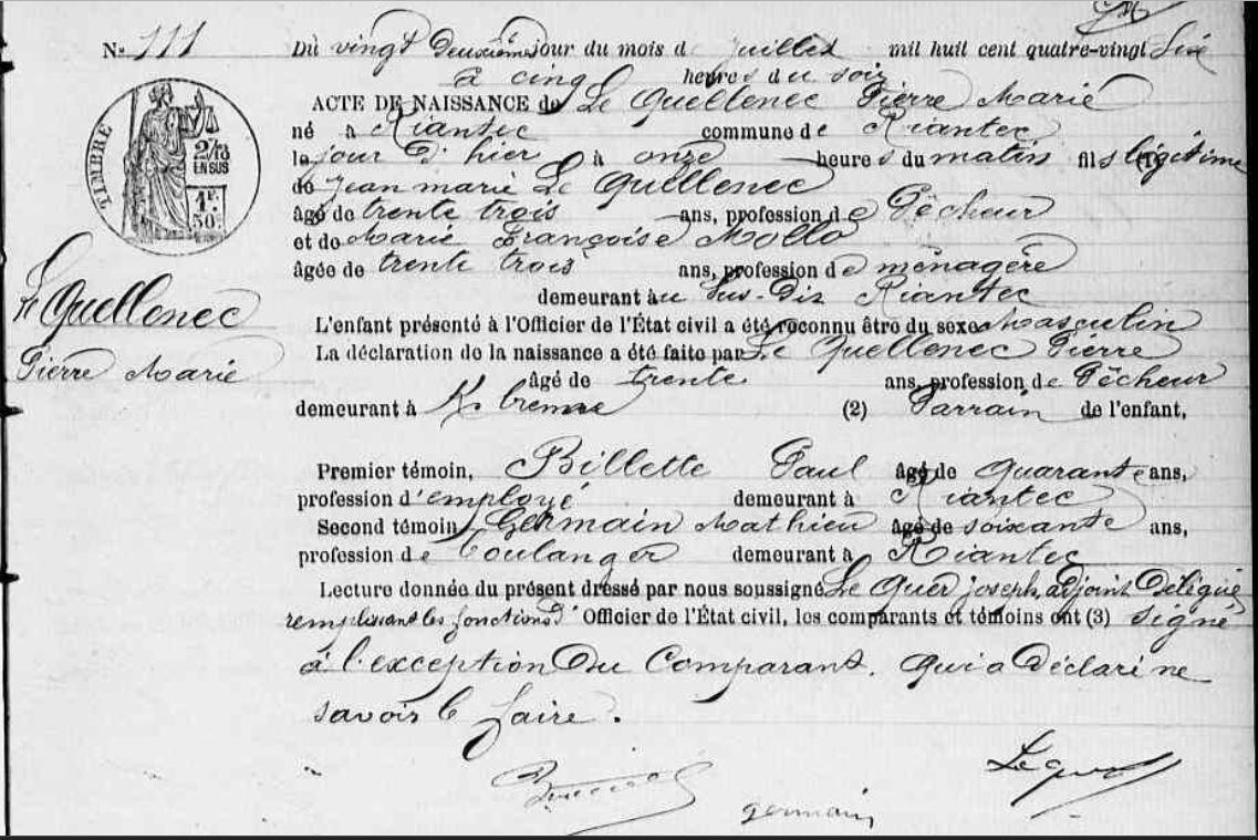 | Naissance QUELLENEC (LE) Pierre Marie - 1886 - Riantec |