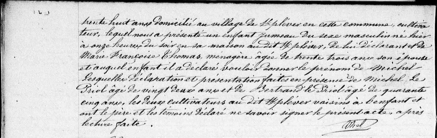 | 1 Note, Naissance : Michel est né jumeau, mais son frère n'aura pas de prénom déclaré car il décèdera unen demie heure plus tard. |
