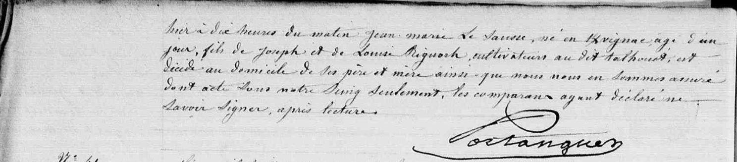 | Il est né 17/04/1855 à Kervignac (56), Talhouët. + 16/07/1855 Kervignac (56), Talhouët, 3 mois - - 1:00 - NO à l'âge de 3 mois. Père : SAUSSE (LE) Joseph, Sosa 92, Cultivateur - Laboureur Naissance : Date : 29/07/1808 Lieu : Kervignac (56), Bourg Décès : Date : 16/12/1879 Lieu : Kervignac (56), Talhouët à l'âge de 71 ans. Mère : RIOCH (LE) (RIGUORH) Louise, Sosa 93, Cultivatrice Naissance : Date : 26/04/1814 Lieu : Kervignac (56) Décès : Date : 30/04/1855 Lieu : Kervignac (56), Talhouët à l'âge de 41 ans. A sa naissance, ses père et mère étaient âgés de 46 ans et 40 ans. |