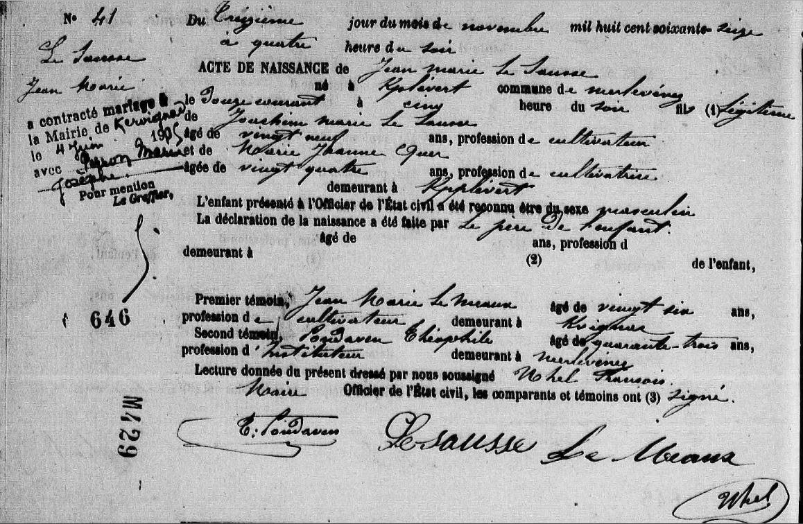 | Il est né 12/11/1876 à Merlevenez (56), Kerplevert 1. Signature : Y. Père : SAUSSE (LE) Joachim Marie, Sosa 46, Cultivateur Naissance : Date : 27/12/1846 Lieu : Kervignac (56), Talhouët Mère : QUER Marie Jeanne, Sosa 47, Ménagère - Cultivatrice Naissance : 2 Date : 26/02/1853 Lieu : Merlevenez (56), Kerplevert A sa naissance, ses père et mère étaient âgés de 29 ans et 23 ans. |