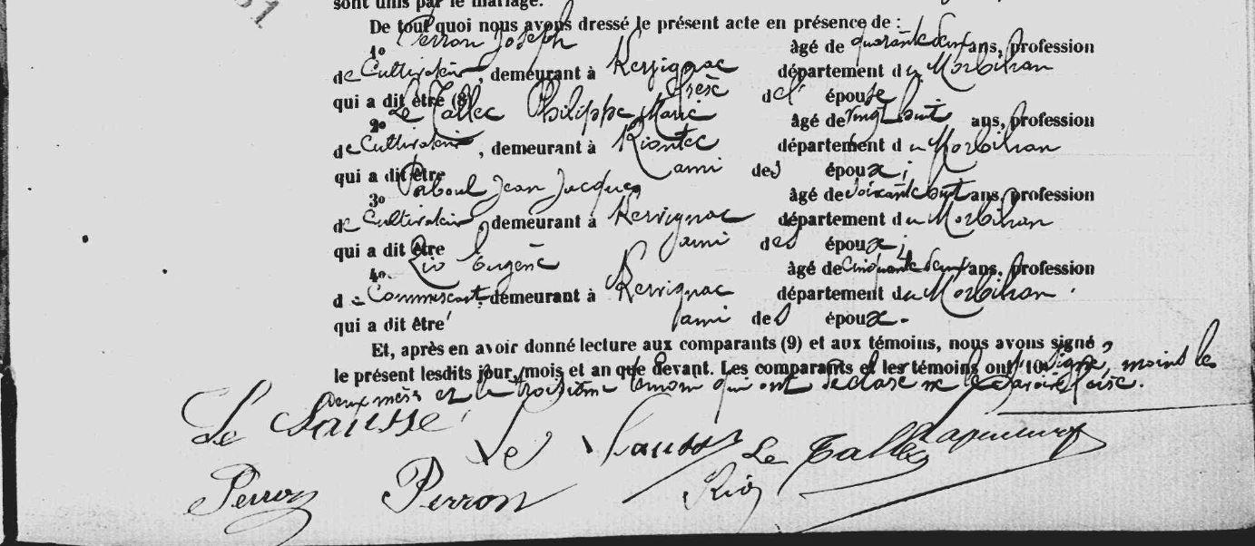 | Mariage : Date : 04/06/1905 Lieu : Kervignac (56) PERRON Marie Josephe, Elle naît 05/04/1879 à Kervignac (56), Coëtrivas 3. |