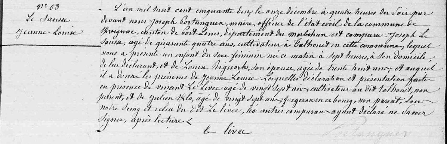 | Naissance SAUSSE (LE) Jeanne Louise - 1852 - Kervignac |