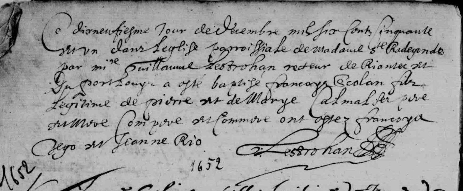 | Il voit le jour à Riantec (56) 19/12/1651. 19/12/1651, a lieu son baptême à Riantec (56), Eglise paroissiale Sainte Radegonde de Riantec. Signature : Non. Père : SCOLAN Pierre Naissance : Date : 09/03/1626 Lieu : Port-Louis (56) Décès : Date : ../../1671 à plus de 44 ans. Mère : CALMAR Marie Naissance : Date : ../../1631 Décès : Date : 05/03/1703 Lieu : Riantec (56), Les Salles à environ 72 ans. A sa naissance, ses père et mère étaient âgés de 25 ans et d'environ 20 ans. |