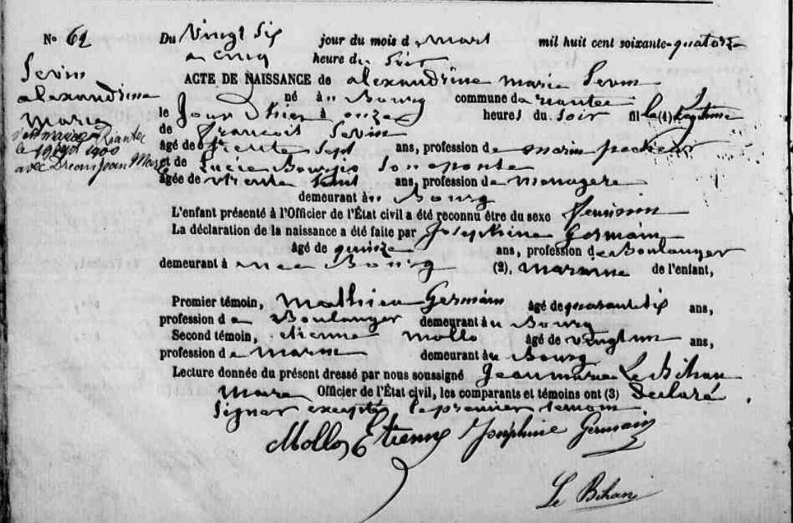 | Elle voit le jour à Riantec (56), Bourg 25/03/1874. Signature : Y. Père : SEVIN Yves François, Marin pêcheur Naissance : Date : ../../1837 Mère : BOUGIO Lucie, Ménagère Naissance : Date : 09/05/1836 Lieu : Baden (56), Bois de Bourgerel Décès : Date : 05/01/1893 Lieu : Riantec (56), Bourg à l'âge de 56 ans. A sa naissance, ses père et mère étaient tous deux âgés de 37 ans. |