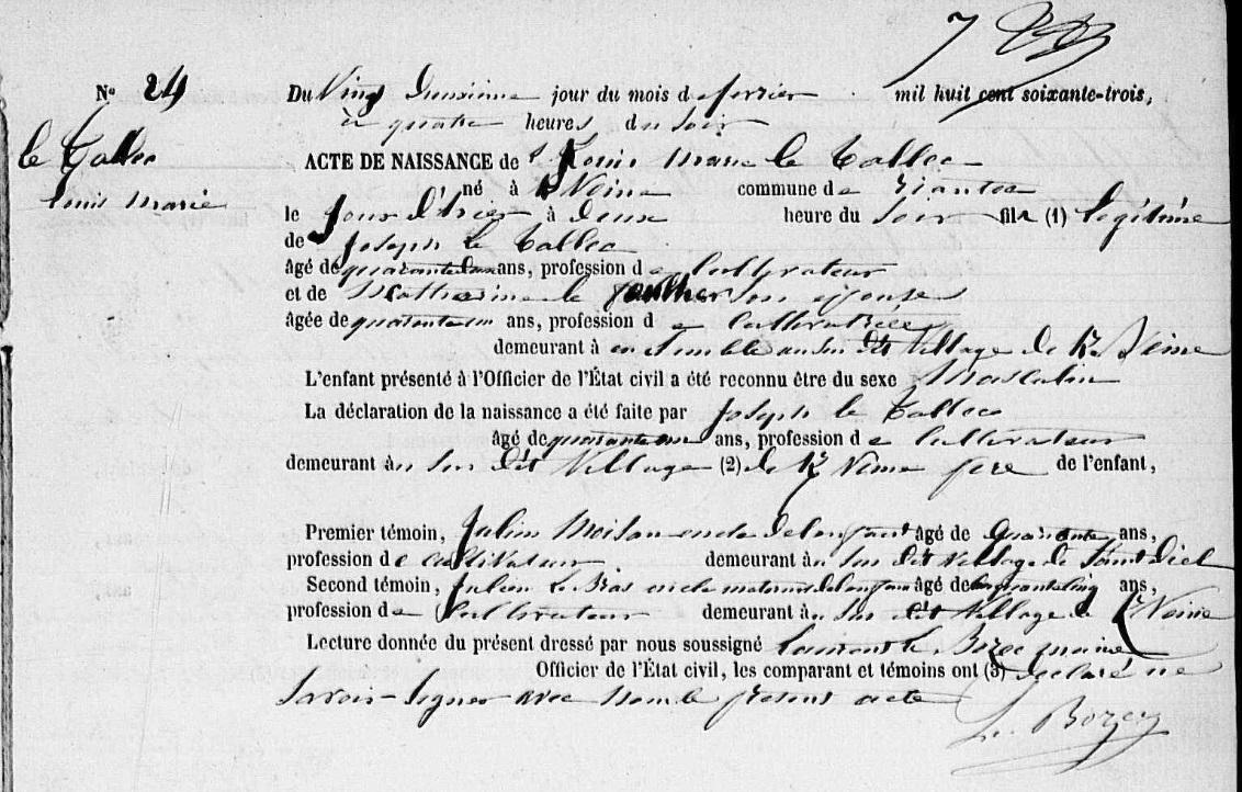 | Il est né à Riantec (56), Kerverne 21/02/1863. Signature : Y. Père : TALLEC (LE) Joseph, Sosa 50, Cultivateur - Laboureur Naissance : Date : 26/11/1820 Lieu : Kervignac (56) Décès : Date : 24/10/1882 Lieu : Riantec (56), Bois d'Amour à l'âge de 61 ans. Mère : FOULHER (LE) Catherine, Sosa 51, Cultivatrice Naissance : Date : 23/07/1821 Lieu : Riantec (56) Décès : Date : 01/05/1899 Lieu : Riantec (56), Bois d'Amour à l'âge de 77 ans. A sa naissance, ses père et mère étaient âgés de 42 ans et 41 ans. |