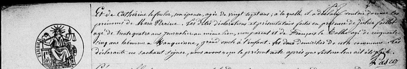 | Il voit le jour 30/08/1810 à Plouhinec (56). Père : TALLEC (LE) François, Sosa 244, Laboureur Naissance : Date : 05/01/1770 Lieu : Kervignac (56), Kerguenen Décès : Date : 12/01/1812 Lieu : Plouhinec (56) à l'âge de 42 ans. Mère : STEPHANO Perrine, Sosa 245, Sans profession Naissance : Date : 12/11/1780 Lieu : Plouhinec (56) Décès : Date : 17/11/1865 Lieu : Plouhinec (56), Bourg à l'âge de 85 ans. A sa naissance, ses père et mère étaient âgés de 40 ans et 29 ans. |