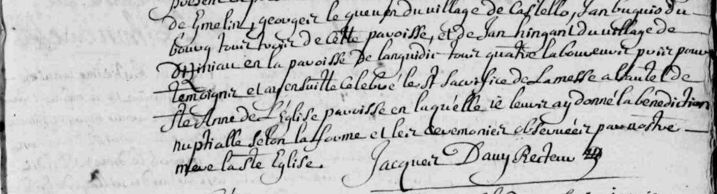 | Enfant(s) de JEGO Pierre et de STEPHANO Anne : - JEGO Yves, Sosa 1056 (Naissance : 1676 Décès : 1735) Union 1699 : QUELLENEC (LE) Anne Enfant(s) de JEGO Yves et de HALEGUEN Catherine : - JEGO Marie (Naissance : 1662 Décès : 1730) Union 1684 : JEGO Jean - JEGO Françoise (Naissance : 1669 Décès : 1698) Union 1684 : JEGO Jacques - JEGO Jacquette, Sosa 1497 (Naissance : 1672 Décès : 1730) Union 1696 : KERHOUANT Michel - JEGO Gilette (Naissance : 1674) Union 1698 : CANDALH Jean - JEGO Jan (Naissance : 1677) - JEGO François (Naissance : 1680) Enfant(s) de JEGO Jacques et de JEGO Marguerite : - JEGO Jeanne, Sosa 2039 (Naissance : 1678 Décès : 1722) Union 1705 : GUENNEC (LE) Simon |