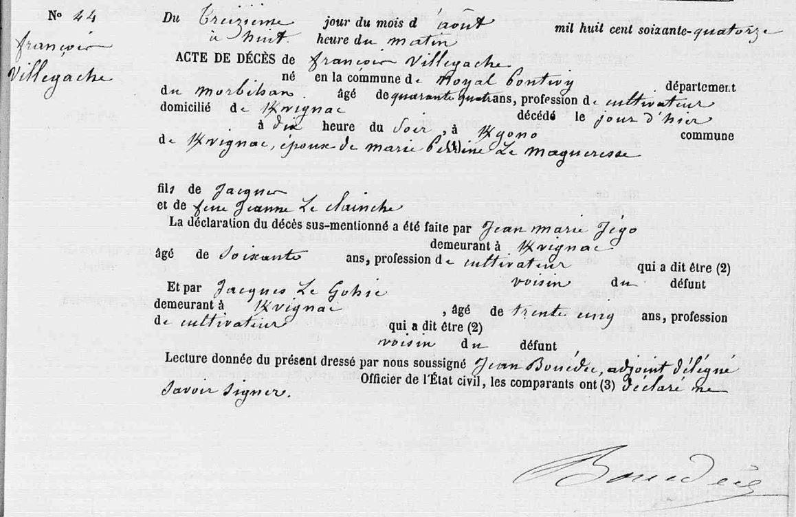 | 1. VILLEGACHE François Naissance : Date : ../../1830 Lieu : Noyal-Pontivy (56) Uni avec MAGUERES (LE) Marie Perrine. Décès : Date : 12/08/1874 Lieu : Kervignac (56), Kergono à l'âge de 44 ans. |