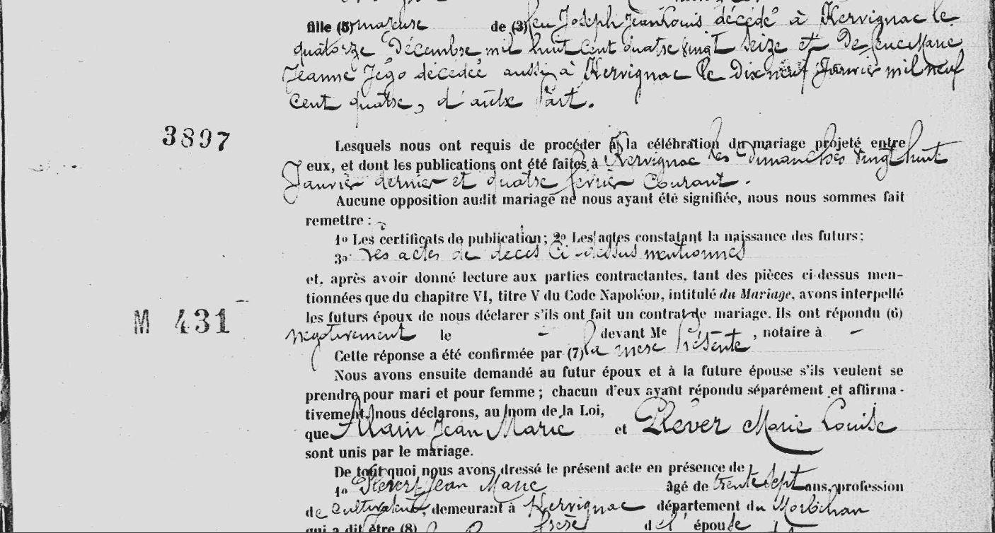 | 1. ALLAIN Jean Marie Naissance : Date : 21/12/1875 Lieu : Kervignac (56), Kernours Union : Date : 18/02/1906 Lieu : Kervignac (56) avec PLEVERT Marie Louise. |