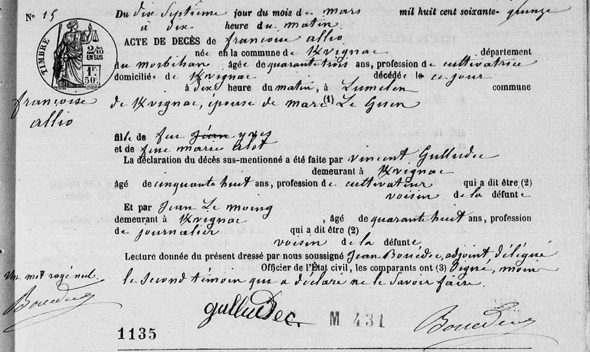 | 1. ALLIO Marie Françoise Naissance : Date : ../../1832 Lieu : Kervignac (56) Unie avec GUEN (LE) Marc. Décès : Date : 17/03/1875 Lieu : Kervignac (56), Lumelen à l'âge de 43 ans. |