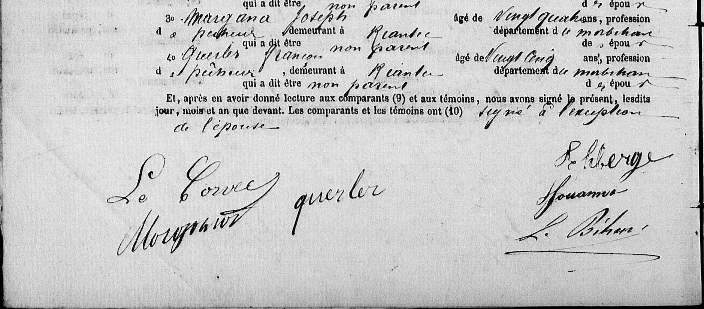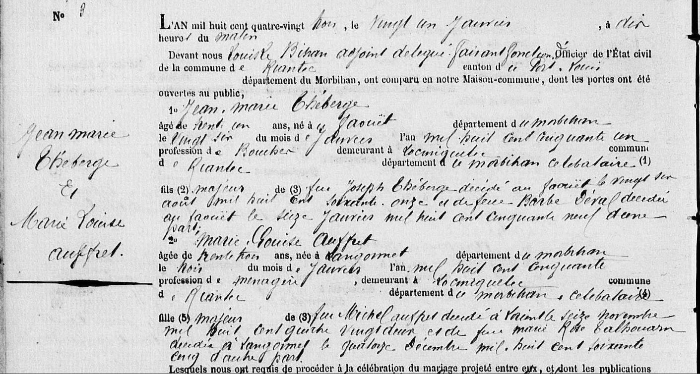 Mariage THEBERGE Jean Marie AUFFRET Marie Louise - 1883 - Riantec - 2 |
