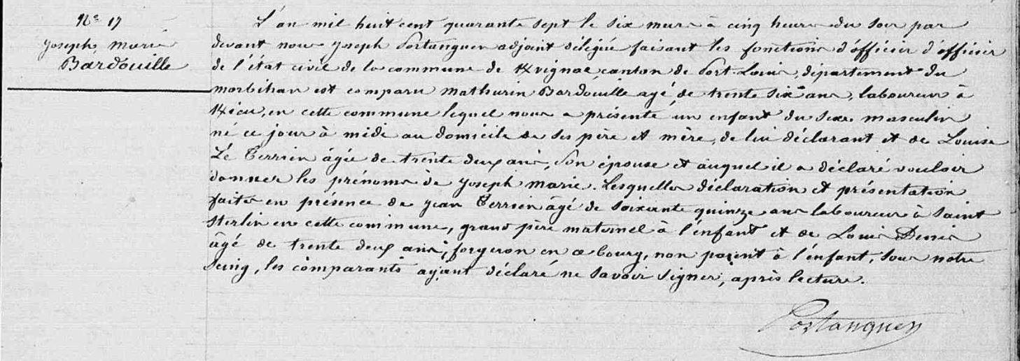 | Naissance BARDOUILLE Joseph Marie - 1847 - Kervignac |