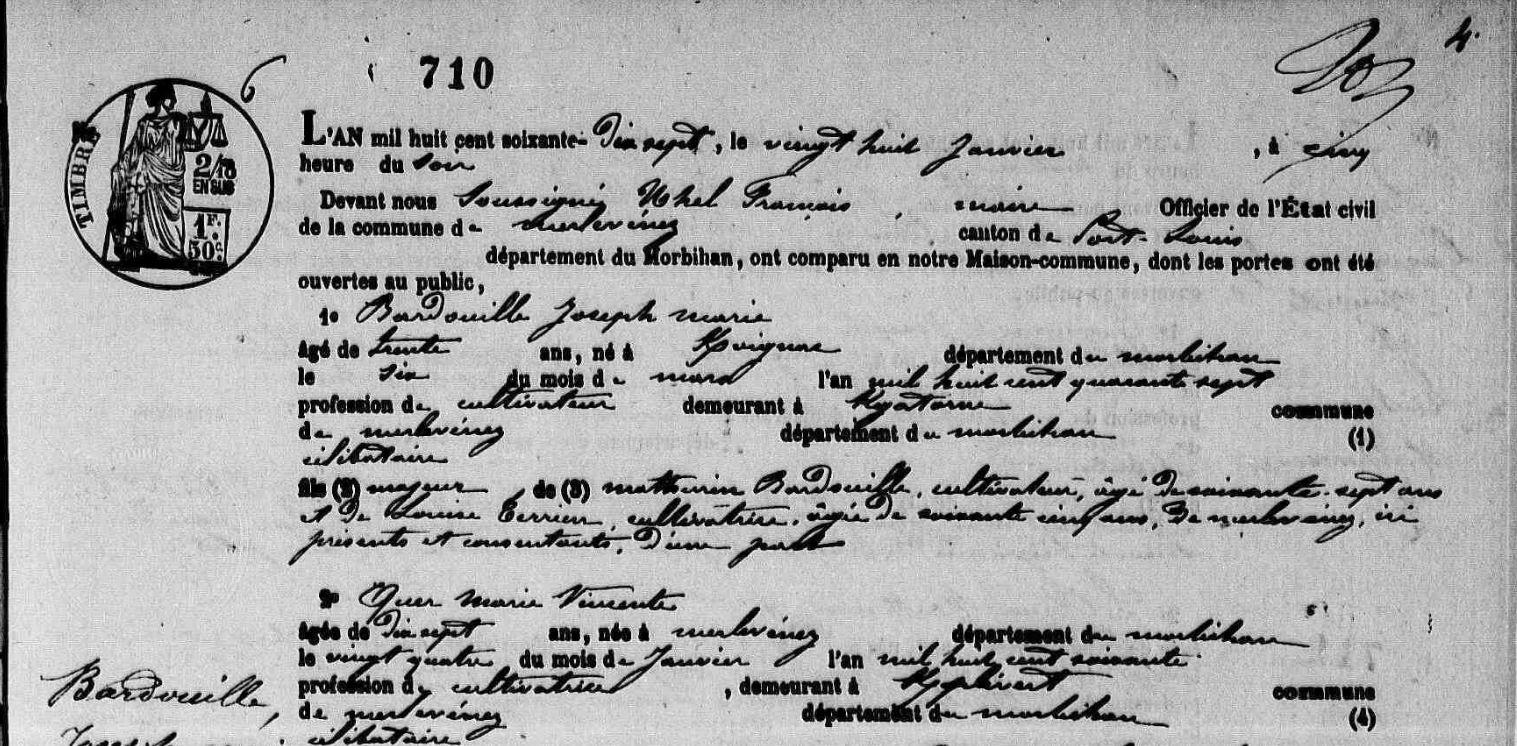 Mariage BARDOUILLE Joseph Marie QUER Marie Vincente - 1877 - Merlevenez - 2 |
