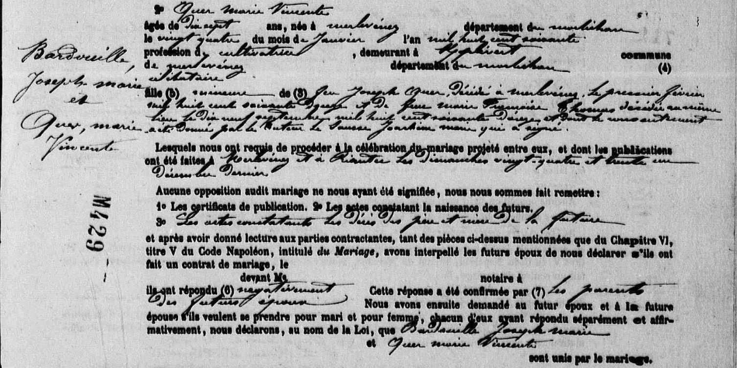 Mariage BARDOUILLE Joseph Marie QUER Marie Vincente - 1877 - Merlevenez - 1 |