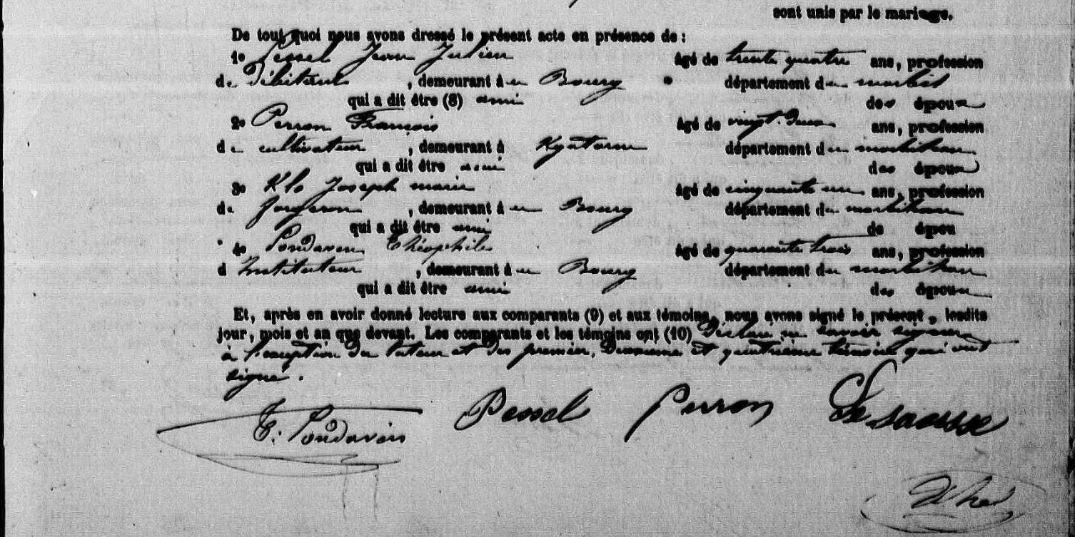 | 1 Note, Union : Le consentement au mariage a été donné pour l'épouse par son tuteur, Joachim LE SAUSSE, Marin pêcheur, de Riantec, car les publications des bans y ont été faites également alors que les époux sont tous deux domiciliés à Merlevenez. |