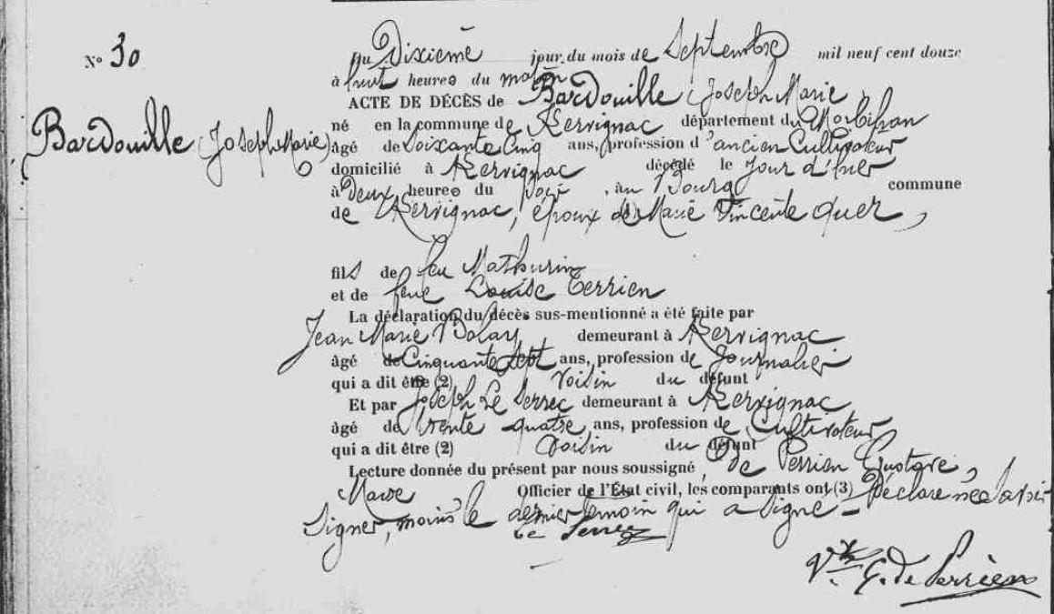 | Décès BARDOUILLE Joseph Marie - 1912 - Kervignac |