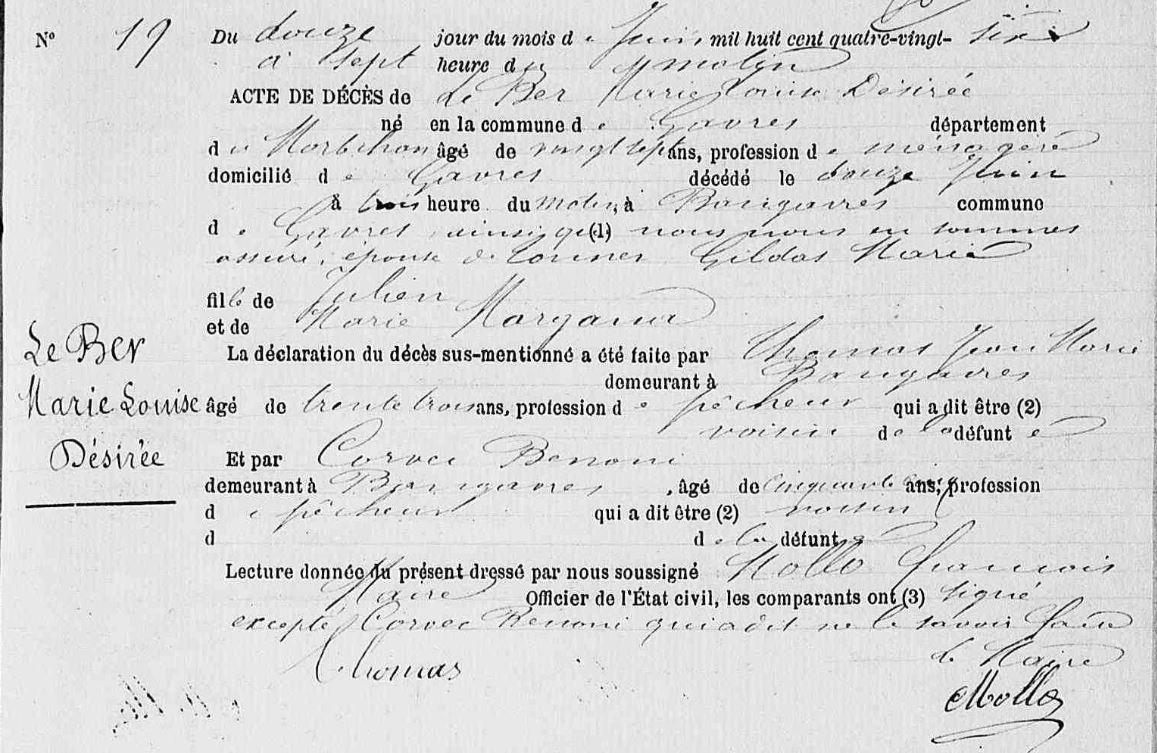 | Décès BER (LE) Désirée Marie Louise - 1886 - Gâvres |
