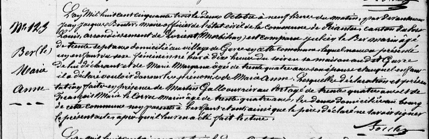 | Naissance BER (LE) Marie Anne - 1853 - Riantec |