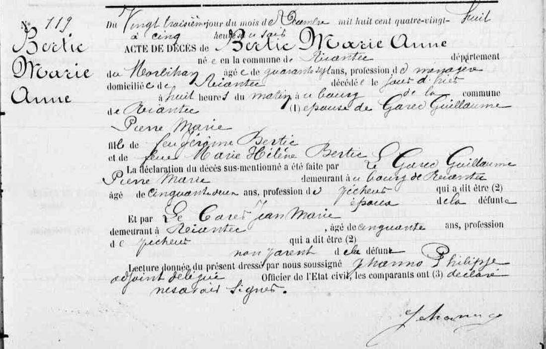 | 1. BERTIC Marie Anna Naissance : Date : ../../1842 Unie avec GARREC Guillaume. Décès : Date : 22/12/1888 Lieu : Riantec (56), Bourg à l'âge de 46 ans. |