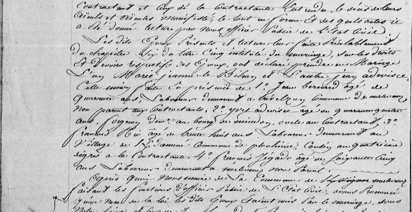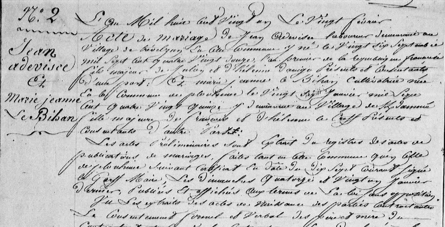 | - BIHAN (LE) Julien, Sosa 234 (Naissance : 1774 Décès : 1822) - LESCOËT Françoise, Sosa 235 (Naissance : 1766 Décès : 1830) Union 1785 : NEZET (LE) Jean, Union 1799 : BIHAN (LE) Julien |
