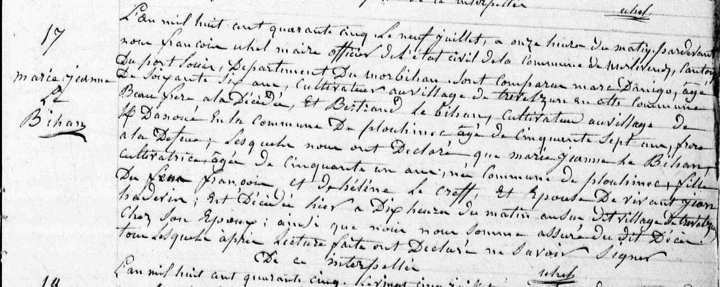 Décès BIHAN (LE) Marie Jeanne - 1845 - Merlevenez |