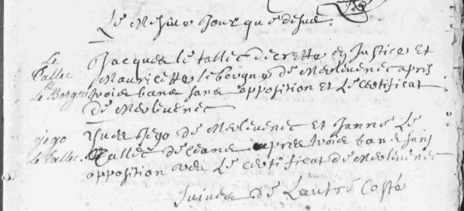 | 1 Note, Union : Noté entre le 07/02/1690 et 13/02/1690 en raison d'un acte de Baptême présent juste avant et daté du 07/02/1690, puis d'un autre acte de Baptême après, daté du 13/02/1690. |
