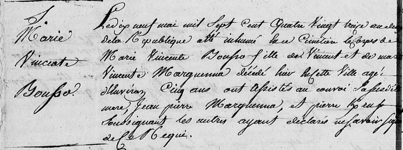 | 3. BOUSSO Marie Vincente Naissance : Date : ../../1788 Décès : Date : 18/05/1793 Lieu : Baud (56), Bourg à environ 5 ans. |