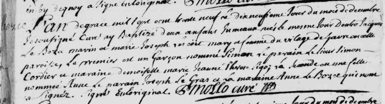 | Enfant(s) de BOZEC (LE) Jacques et de LESCOËT Marie : - BOZEC (LE) Raymond (Naissance : 1731) - BOZEC (LE) Pierre (Naissance : 1731) - BOZEC (LE) Jacques (Naissance : 1733) - BOZEC (LE) Joseph (Naissance : 1734) - BOZEC (LE) Jean François (Naissance : 1736) - BOZEC (LE) René Gildas (Naissance : 1738) - BOZEC (LE) Simon (Naissance : 1739) |