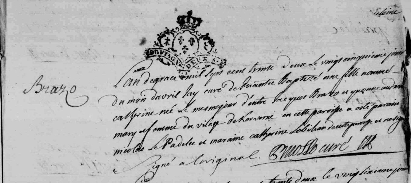 | Baptême BRAZO Guillaume - 1728 - Riantec |