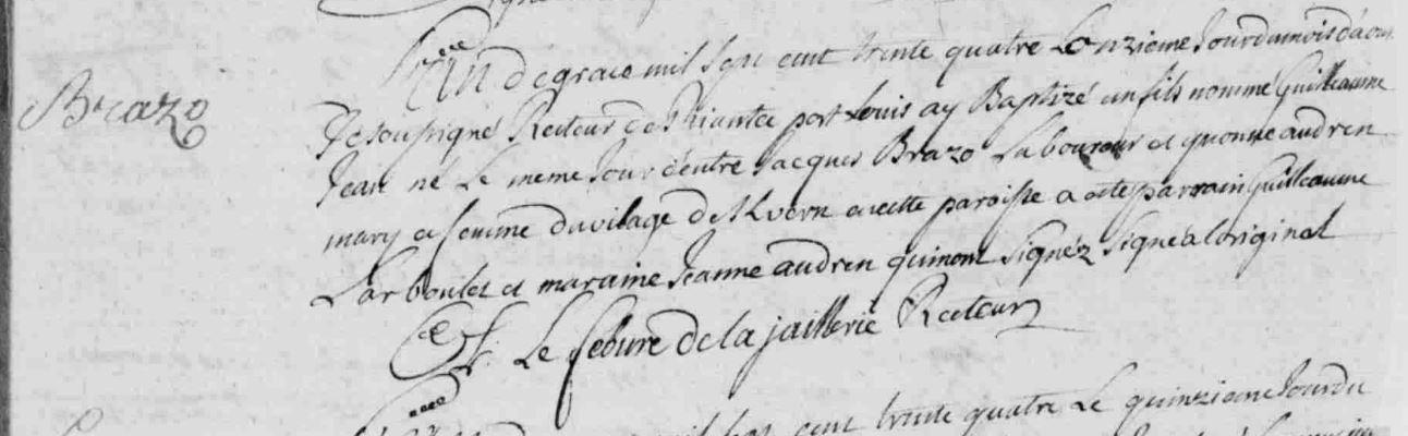 | Baptême BRAZO Guillaume Jean - 1734 - Riantec |
