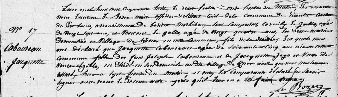 | 5. CABOUREAU Jacquette, Sosa 73 Naissance : Date : 24/12/1792 Lieu : Riantec (56), Dreff Union : Date : 18/05/1817 Lieu : Riantec (56) avec GALLO (LE) Vincent, Sosa 72. Décès : Date : 01/02/1858 Lieu : Riantec (56), Kerner à l'âge de 65 ans. |