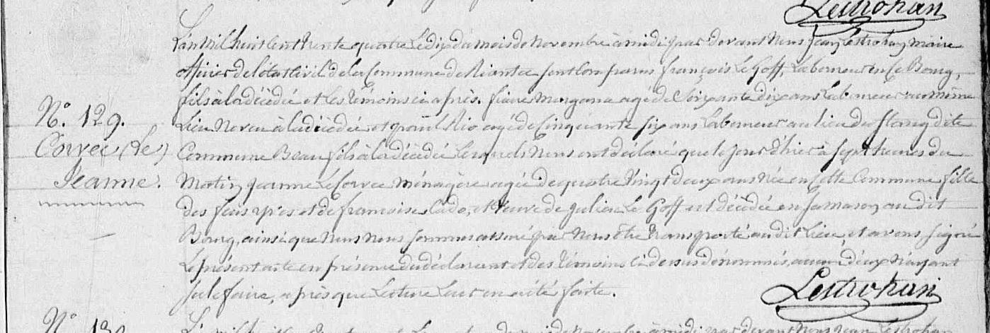 | 3. GOFF (LE) François, Sosa 82 Naissance : Date : 16/07/1784 Lieu : Riantec (56), Bourg Union : Date : 01/02/1811 Lieu : Riantec (56) avec GUENNEC (LE) Anne, Sosa 83. Décès : 3 Date : 08/11/1845 Lieu : Riantec (56), Bourg à l'âge de 61 ans. |