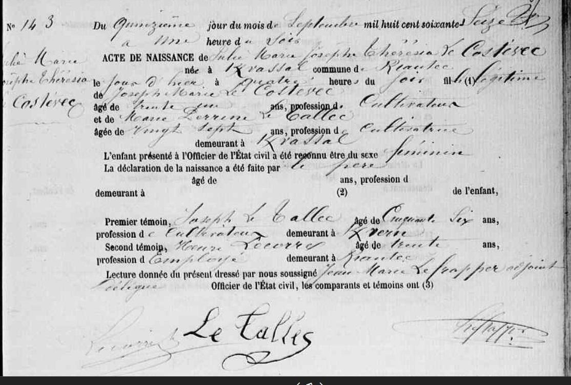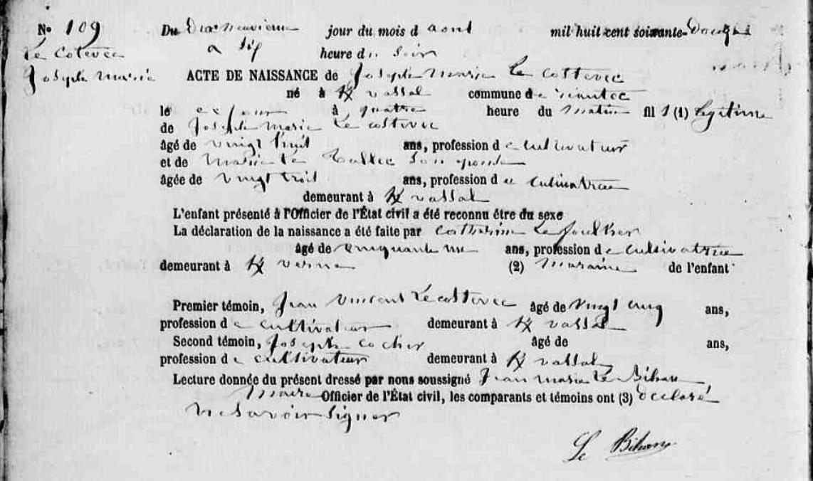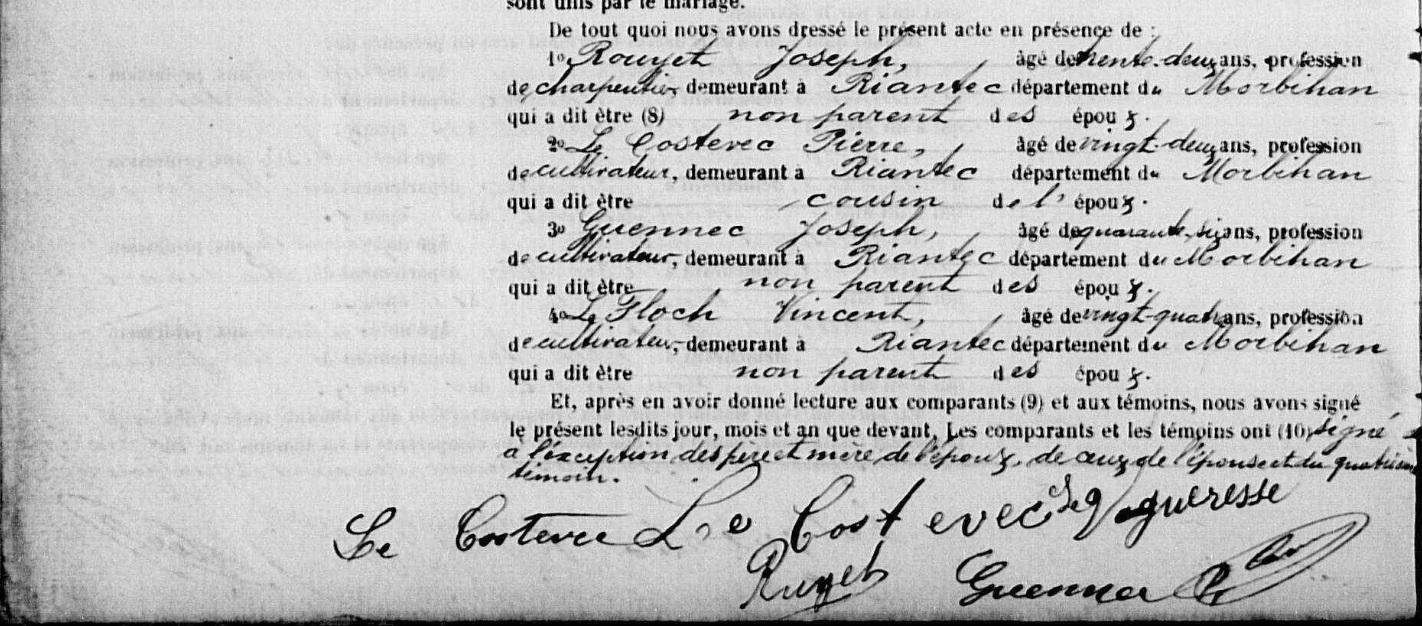 | Il est né à Riantec (56), Kervassal 19/08/1872. Signature : Y. Père : COSTEVEC (LE) Joseph ( Marie ), Sosa 24, Cultivateur Naissance : Date : 04/02/1845 Lieu : Riantec (56), Kervassal Mère : TALLEC (LE) Marie Perrine, Sosa 25, Cultivatrice - Ménagère Naissance : Date : 11/01/1849 Lieu : Riantec (56), Petit Branroch Décès : Date : 19/04/1906 Lieu : Riantec (56), Kervassal à l'âge de 57 ans. A sa naissance, ses père et mère étaient âgés de 27 ans et 23 ans. |