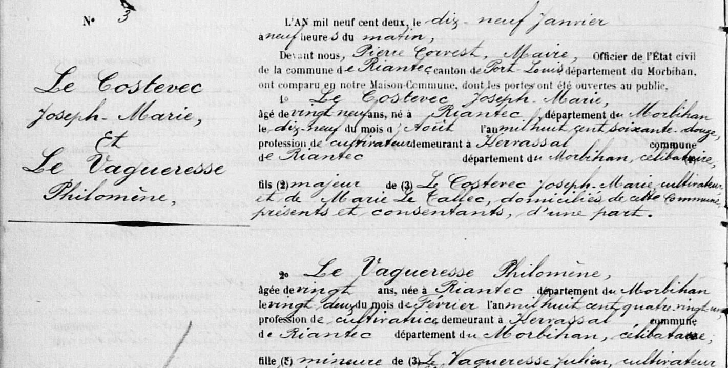 Mariage COSTEVEC (LE) Joseph Marie VAGUERESSE (LE) Philomène - 1902 - Riantec - 3 |