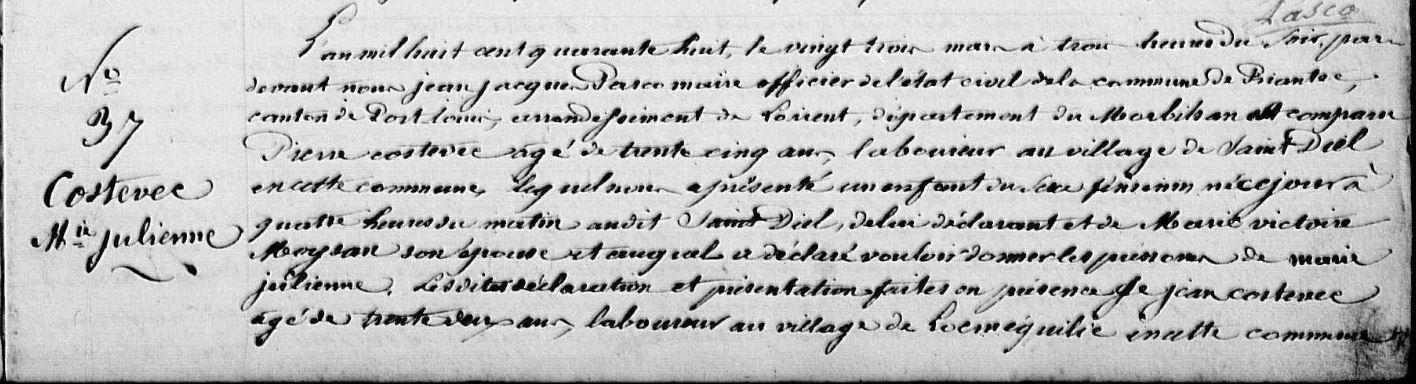 | Signature : Non. Père : COSTEVEC (LE) Jean Louis, Cultivateur Naissance : Date : ../../1800 Mère : |