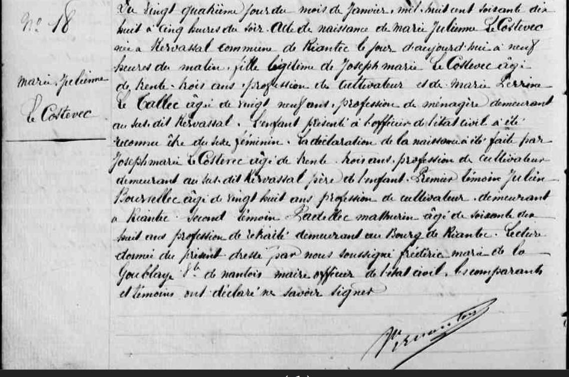 | Naissance COSTEVEC (LE) Marie Julienne - 1845 - Riantec |