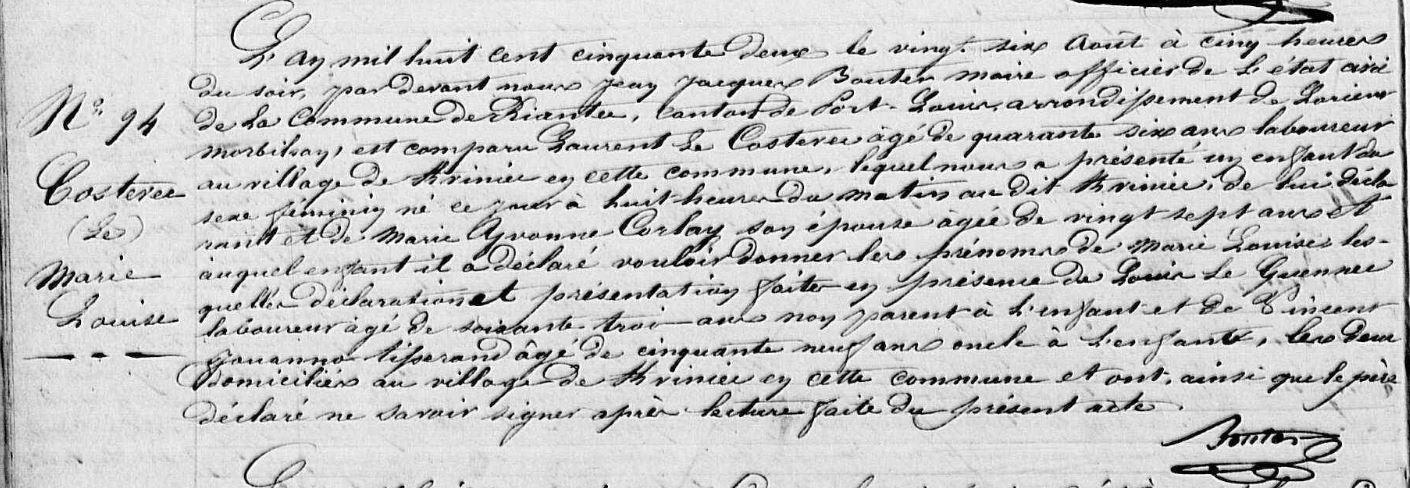 | Naissance COSTEVEC (LE) Marie Louise - 1852 - Riantec |