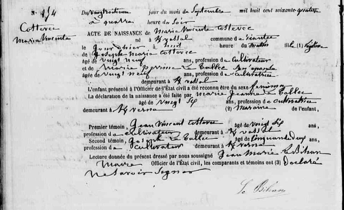 | Naissance COSTEVEC (LE) Marie Vincente - 1874 - Riantec |